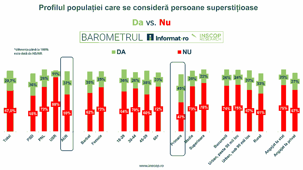 Se consideră persoane superstițioase mai ales: votanții PSD și AUR, bărbații, persoanele cu educație primară, locuitorii din mediul rural și din urbanul mic. Nu se consideră persoane superstițioase în special: votanții USR, femeile, cei cu educație superioară.