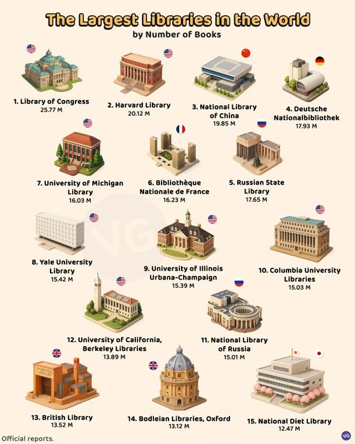 Cele mai mari 15 biblioteci din lume după numărul de volume. Infografie publicată de VGraphs. Conform sursei, ordinea este: