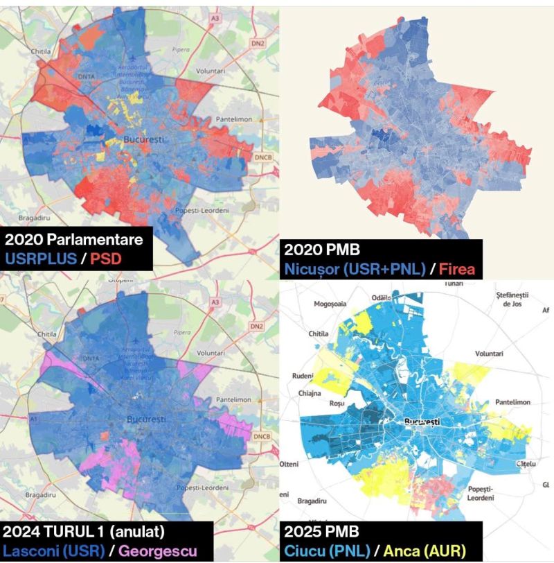 Hărțile au o segmentare relativ similară, însă practic relevă schimbări semnificative. În 2020 și 2024 în zonele marcate cu albastru voturile au mers majoritar spre USR sau candidați independenți proveniți din zona USR (Nicușor Dan). În 2025, zonele marcate cu albastru au fost câștigate de candidatul PNL Ciprian Ciucu.