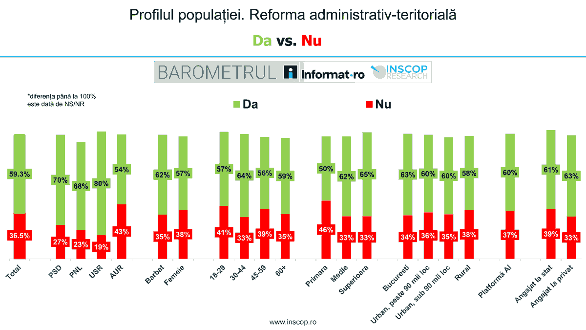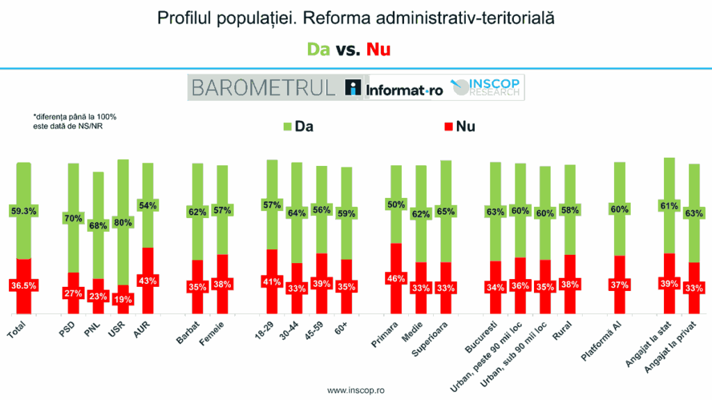 Sondajul Barometrul Informat.ro-INSCOP Research din martie 2026 relevă o susținere masivă a reformei administrativ-teritoriale în România, reflectând un consens larg în rândul populației. Aproape 6 din 10 români cred că o astfel de reformă, inclusiv comasarea localităților sau crearea de regiuni cu mai multe județe, ar îmbunătăți semnificativ calitatea serviciilor publice.