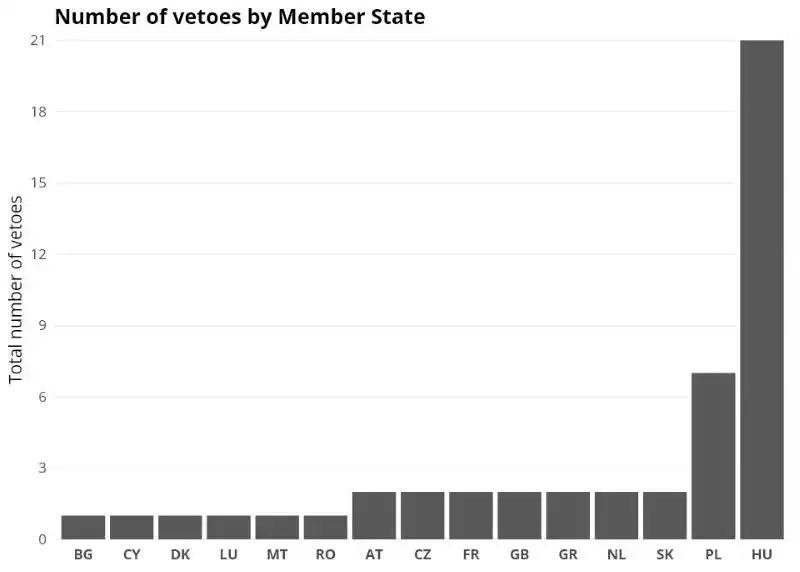 Conform datelor strânse de Michal Ovádek și publicate pe Github, din 2011 până în prezent 15 state membre și-au exercitat dreptul de veto în 48 de ocazii. Ultimele 5 au fost în decurs de un an și au avut rolul de a împiedica sancțiuni contra Rusiei (3 dintre ele) și ajutoare pentru Ucraina (2). Dintre cele 5, 4 veto-uri au fost exprimate de Ungaria, iar unul de Slovacia.